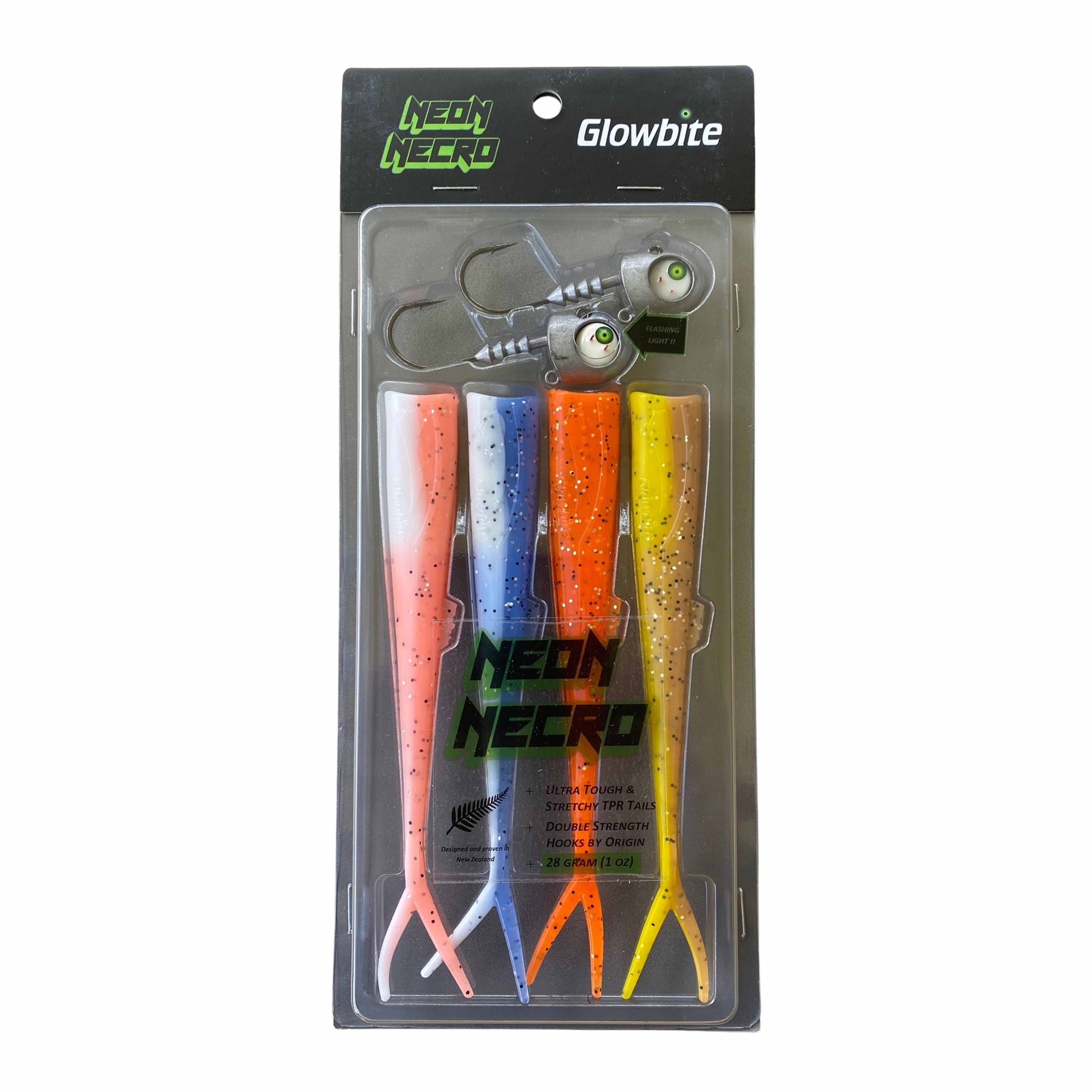 Neon Necro Sampler is an innovative soft plastic lure designed to be one of the best baits for fishing in depths from 1 to 30 meters. Featuring a water activated flashing light that imitates the light reflected off a stressed bait fish. Thermoplastic rubber (TPR) lure tails for greater flexibility and lasting resilience. The Neon Necro lures big predator fish even in low visibility. Offered in four weight options from 3/8 oz through 1 oz, with a custom lure head and hook made to position the hook point perfectly in the Neon necro tail. The Sampler pack bundles multiple Neon Necro colours so you can easily test what the fish are feeding on today.